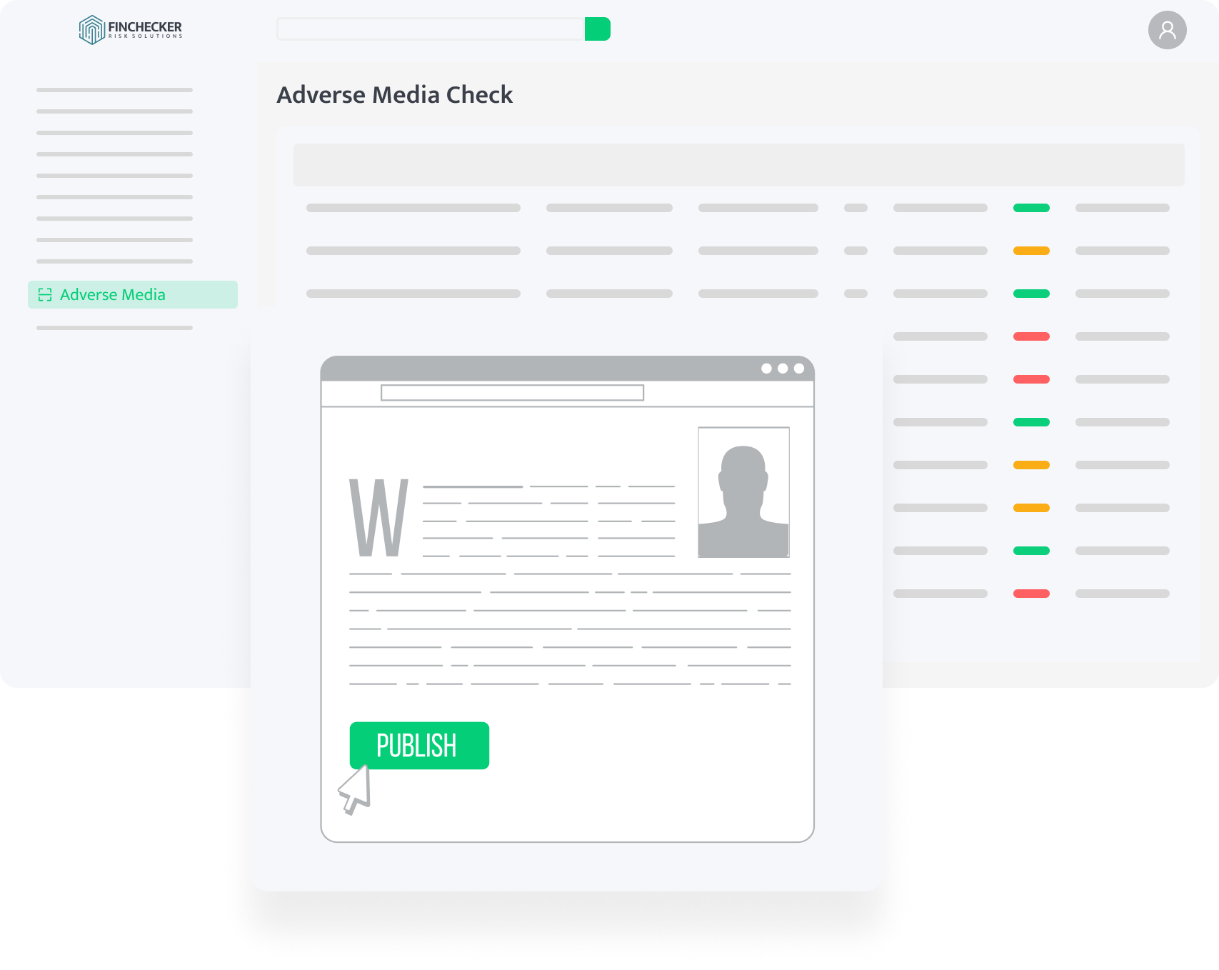 Finchecker Adverse Media Screening - a custom solution designed to safeguard your business from interactions with dubious entities or individuals that could lead to reputational, financial, or legal harm. Employ our inclusive-of-features platform to remain compliant, reputationally protected, and operationally efficient.