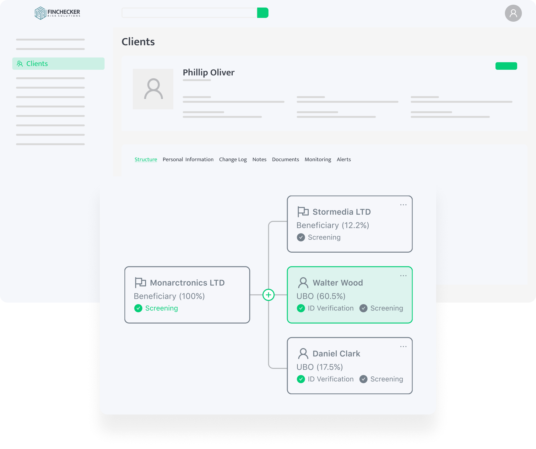 A 'Structure' tab is included for each corporate client, providing a comprehensive view of their structure. This feature enhances the client model with additional attributes like beneficiary type, entity type, and share percentage, offering deeper insights into each client’s structure and influence.